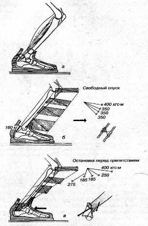 а — современная лыжная обувь, фиксирующая голеностопный сустав, вызывает три вида травм: в области верхнего края ботинка, компрессию переднего края боль-шеберцовой кости, разрыв ахиллова сухожилия; б, в — направление нагрузки при свободном спуске и столкновении с препятствием.