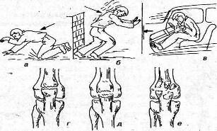 а — падение на колено, б — резкое сокращение четырехглавой мышцы, в _ удар при резком торможении, г — поперечный перелом, д — отрывной,