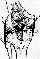 1 — повреждения мениска (футбол, скоростной спуск на лыжах, волейбол, борьба, глубокое приседание), 2 — повреждение крестообразной связки (футбол, скоростной спуск на лыжах, борьба), 3 — комбинированное повреждение капсулы, связок и мениска (футбол, скоростной спуск на лыжах, борьба), возможно при всех тяжелых торсионных травмах; 4 — перелом мыщелков большеберцовой кости (мотоспорт)