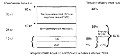 Разные авторы предлагают различные процентные соотношения водных секторов организма, возможно в связи с тем, что в своих расчетах они основываются на общей массе тела. Поскольку количество жира (ткани с относительно низким содержанием воды) колеблется у людей в широких пределах, рекомендуется исходить из идеальной массы тела (ИМТ).