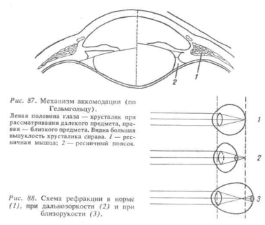 Механизм аккомодации глаза связан с сокращением ресничных мышц, которые изменяют выпуклость хрусталика. Хрусталик заключен в капсулу, переходящую по краям в волокна ресничного пояска (цинновой связки), прикрепленного к ресничному телу (рис. 87). Ресничный поясок всегда натянут, и его натяжение передается капсуле, сжимающей и уплотняющей хрусталик. В ресничном теле находятся гладкие мышечные волокна. При их сокращении наступает ослабление тяги ресничного пояска, а значит уменьшение давления на хрусталик, который вследствие своей эластичности принимает более выпуклую форму.