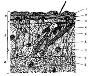 Рис. 13.17. Строение кожи человека: а — надкожица (эпидермис); б — собственно кожа (дерма); в — подкожная жировая клетчатка; 1 —роговой слой эпидермиса; 2—слой живых клеток эпидермиса; 3 — рецепторы кожи; 4 — сальные железы; 5 — потовые железы; б — корень волоса; 7 — кровеносный сосуд; 8 — нерв.