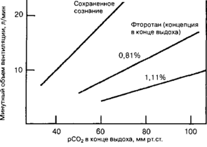 Кривая реакции внешнего дыхания на СО2 показывает влияние ингаляционных анестетиков на минутную вентиляцию легких при подъеме рСОг. При увеличении концентрации ингаляционного анестетика кривая смещается вправо, отражая замедление роста минутной вентиляции в ответ на увеличивающуюся гиперкапнию.