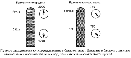 При максимальном заполнении кислородный баллон имеет давление 136 атм. и содержит 625 л данного газа. Поскольку 02 — сжатый газ, между содержащимся в баллоне объемом газа и давлением на манометре существует прямая зависимость. Это означает, что если уровень давления 68 атм., то в баллоне осталось 312 л газа. При потоке 2 л/мин весь этот объем израсходуется в течение 156 мин или приблизительно за 2,5 ч. Максимально заполненный N20 голубой баллон имеет давление 51 атм. и содержит 1590 л этого газа. Закись азота, как жидкость, находящаяся под давлением, ведет себя в закрытой емкости иным образом, чем сжатый кислород. Давление закиси азота в баллоне будет оставаться на уровне 51 атм. до тех пор, пока вся жидкость не перейдет в газообразное состояние, после чего давление начнет падать. К тому моменту, когда давление N20 начинает снижаться в баллоне остается около 40 л газа. Так как мы не знаем, что стоит за цифрой 51 атм. на манометре, увидев ее, мы не скажем, как много N20 осталось и, следовательно, не сможем предсказать, на какое время мы обеспечены этим газом.