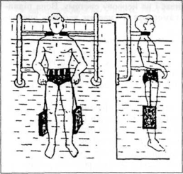 Корекція положенням у воді — це надання кінцівкам або тулубу певного фіксованого положення (рис. 4), що супроводжується розтягуванням тканин, шкіри, зв'язково-суглобового апарату, м'язів. Застосовується цей метод найчастіше при обмеженні рухів у суглобах і контрактурах. Він є заключним після вправ у воді, підводного масажу, витягнення, які підготували тканини для подальших інтенсивних дій. Для корекції положенням у воді використовуються спеціальні пристрої, вантажі різної ваги, фіксуючі шини, лямки, що утримують потрібний сегмент у необхідному положенні, створюючи певний тиск на цю ділянку протягом 15-20 хв. Під час процедури треба спостерігати за реакцією хворого на коригуючі дії і зусилля. Вони не повинні бути надмірними як за часом так і за інтенсивністю, супроводжуватись болем, тому що це може спричинити протилежний ефект — рефлекторне напруження м'язів, а інколи і відмову хворого від лікування цим методом.