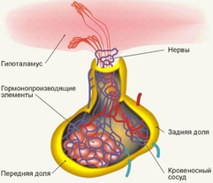 Гипофиз - нижний мозговой придаток, выделяет в кровь нейрогормоны, регулирующие рост организма, срункции надпочечников. Избыток соматотропного гормона приводит к гигантизму, недостаток — замедлению роста.
