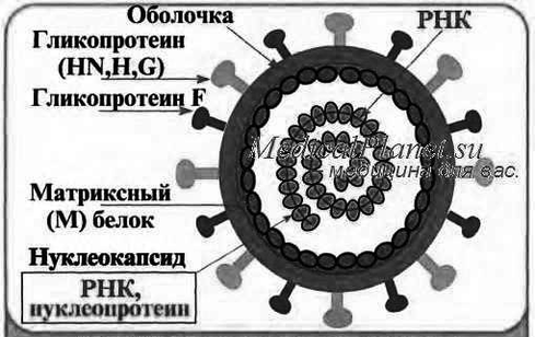 Компоненты вирусной оболочки включают М-белок на внутренней поверхности, а также Н- и F-белки на наружной поверхности. С помощью белка Н вирус прикрепляется к поверхности клетки. F-белок обеспечивает слияние вирусной и клеточной мембран, способствуя пенетрации вируса и разрушению клетки (рис. 1).