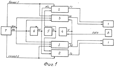 Устройство также содержит два регулятора 3 напряжения питания излучателей, входы управления которых соединены с выходом установки УСТ, выходами КАНАЛ 1, КАНАЛ 2, выходом NA адреса кода частоты, схемы управления 7, а пусковые входы - с выходом U источника стабилизированного напряжения 4, запоминающий блок 6, вход которого соединен с выходом NA схемы управления 7, схему 8 дистанционного управления, выход которой подключен к пусковому входу источника 4.[7]