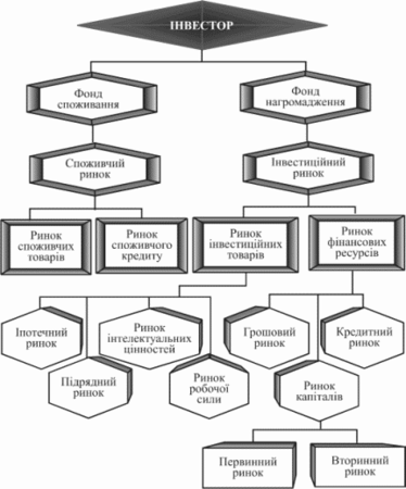 Інвестиційна діяльність завжди починається з ринку, оскільки заощаджень і поточних доходів потенційному інвестору, як правило, не вистачає. Крім цього, інвестор зазвичай намагається залучити акціонерний капітал з метою зменшення ризику та розподілу відповідальності. Наведена схема ринкових відносин, суб’єктом яких є інвестор (рис. 1.1).