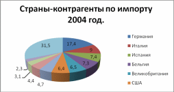 В таблице 4 представлено распределение импорта Франции в 2004 и 2008 годах. Большинство крупнейших стран-контрагентов являются членами ЕС (Германия, Италия, Испания, Бельгия, Великобритания, Нидерланды, Испания), при чем эти же страны входят и десятку партеров по экспорту Франции. Самым важным торговым партнером по импорту является Германия, в 2004 году на нее приходилось 17,4 % всего импорта, а в 2008 году 16,4 %. Другие партнеры Франции – Китай, Япония, США, Россия (вошла в десятку крупнейших стран-контрагентов в 2008 году). В 2008 году импорт Франции в России превышал импорт в Швейцарию. За исследуемый промежуток более всего увеличился импорт Франции из Китая, прирост в 2008 году в сравнении с 2004 годом составил 38,3 %.
