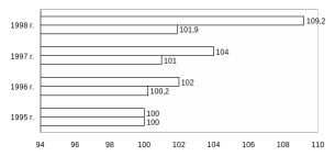 | Расчет: 1995г. 100; 1996г. 100+0,2=100,2 1997г. 100,2*(100+0,8)/100=101; 1998г 101*(100+0,9)/100=101,9. | ||||