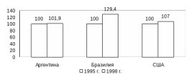 | Аргентина Бразилия США | 100 100 100 | 100,2 115,8 102,9 | 101 125 105,3 | 101,9 129,4 107 | 101,9-100=1,9пунктов или 1,02 раза 129,4/100=1,29 раза 107/100=1,07 раза |