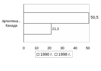 Между Аргентиной и Канадой разрыв по рассматриваемому показателю увеличивается, так как доля Аргентины сократилась до 21,3% ВВП Канады в 1998г. по сравнению с 50,5% в 1990г.