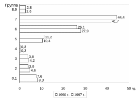 | Группа товаров | 1990 г. | 1997 г. | ||