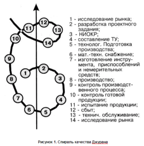 Дж. Джуран первым обосновал переход от контроля качества к управлению качеством. Им разработана знаменитая «спираль качества» (рисунок 1) – вневременная пространственная модель, определившая основные стадии непрерывно развивающихся работ по управлению качеством и послужившая прообразом многих появившихся позже моделей.