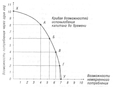 На приведенном графике кривая ХУ демонстрирует все сочетания возможного использования капитала во времени на цели текущего и будущего (будущий период ограничен одним годом) потребления. Отрезок ОУ на горизонтальной оси характеризует альтернативные возможности доступного для данного капитала текущего потребления (от полного отказа от текущего потребления в точке 0 до полного использования капитала на текущее потребление в точке У). Соответственно отрезок ОХ на вертикальной оси характеризует альтернативные для данного капитала потенциальные возможности будущего потребления. Конкретные возможности альтернативного соотношения объемов текущего и будущего потребления в пределах используемой суммы капитала демонстрируют точки А, Б, В и Г, расположенные на кривой ХУ. При выборе любой из этих альтернатив объем возможного потребления инвестора через один год будет превышать объем потребления, от которого он отказывается в текущем году.