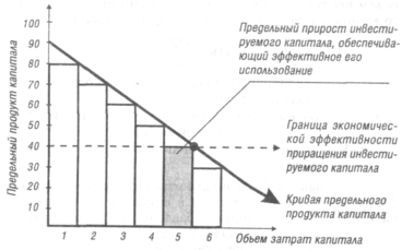 Из приведенного графика видно, что по мере увеличения объема инвестирования капитала его предельный продукт уменьшается с каждой новой задействованной единицей (при неизменной технологии и объеме затрат других факторов производства).