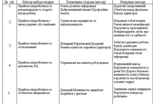 Позитивні та негативні сторони методів набору кадрів в організацію
