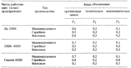 где Р1, Р2, Р3 - весовые коэффициенты важности показателей: У1 - организационного, У2 - технического и У3 - математического обеспечения. Значения P1, Р2, Р3 в зависимости от класса предприятия приведены в табл. 1.
