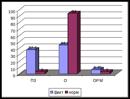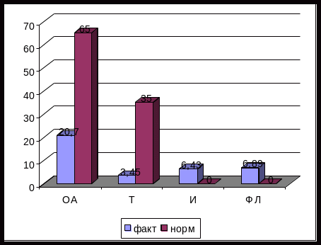 Из рис.2 видно, что по содержанию труда также наблюдается нерациональное использование рабочего времени: временные затраты на выполнение основной работы боле чем в два раза меньше, чем полагается. Значительное время руководитель затрачивает на выполнение подготовительно-заключительных операций.