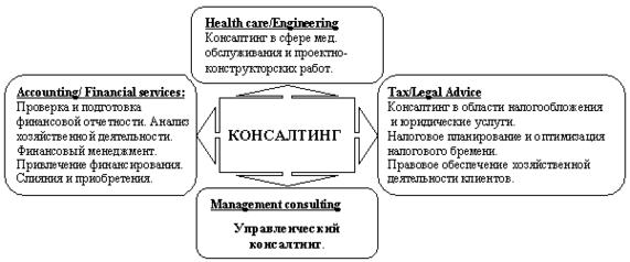 Суть консалтинга заключается в помощи клиенту повышать эффективность своей деятельности и создавать стоимость, как путем предоставления информации и рекомендаций, так и предоставляя свои услуги в достижении поставленных целей. Консультантам приходится изучать и анализировать ситуацию, выдвигать гипотезы и предлагать нововведения, а также убеждать клиентов в необходимости предлагаемых мер и претворять их в жизнь. Основными клиентами консалтинговых фирм являются крупные компании, список которых регулярно публикуется в журнале Fortune или национальных аналогичных изданиях. В зависимости от направления деятельности фирмы-клиента, ее размеров, характера решаемых ею проблем, консультанты решают самые разнообразные задачи, начиная от налогового планирования, исследования новых рынков, проектирования систем управления производством и заканчивая юридическим обеспечением деятельности корпораций, подбором персонала и тим-билдингом (team-building). Невозможно охватить все многообразие направлений их деятельности в небольшом обзоре, но можно попытаться классифицировать достаточно широкий спектр услуг, который данные компании предоставляют своим клиентам в несколько основных направлений. Для этого рассмотрим структуру отрасли. Основные направления деятельности компаний, осуществляющих свою деятельность в сфере консалтинга, представлены на рисунке 1. Предлагаемая классификация носит функциональный характер и основывается на сложившейся мировой практике: Поскольку многие компании в сфере консалтинга являются довольно влиятельными и уважаемыми в деловых кругах, имеет смысл остановиться на этом поподробнее.