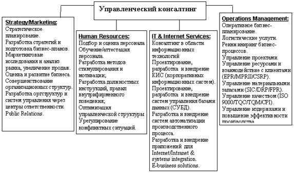 Управленческий консалтинг – это вид деятельности, направленный на решение проблем и/или задач, стоящих перед менеджерами высшего звена в области стратегического планирования, управления хозяйственной, инвестиционной и финансовой деятельностью, оптимизации и повышения эффективности деятельности компании, а также проведение необходимых для этого аналитической и исследовательской работы. Конечным результатом деятельности является не только решение проблем, с которыми сталкиваются управляющие, но и повышение эффективности деятельности компании в целом и/или увеличению индивидуальной производительности труда каждого работника, а в некоторых случаях создание конкурентных преимуществ и вывод компании на новый уровень. Классификация, которая приводиться, не претендует на полноту и всеобъемлющий характер, но представляет собой попытку систематизировать и структурировать основные направления деятельности консалтинговых компаний, услуги ими предоставляемые и привести примеры компаний специализирующихся в каждой из выделенных областей. Хотя подобная группировка представляет собой довольно упрощенный вариант действительности и не отражает всех особенностей деятельности некоторых фирм, она позволяет получить представление об отрасли и ее структуре с функциональной точки зрения.