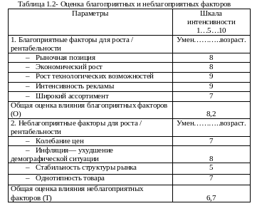 Соответствующим образом оценивается вероятность возникновения неблагоприятных и благоприятных факторов для роста (рентабельности) предприятия в данной СЗХ (таблица 1.2).