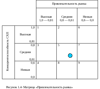 На основе полученных уровней привлекательности рынка и конкурентоспособности рынка строится матрица стратегического анализа. По горизонтальной оси отмечаются интервалы уровней привлекательности рынка, а по вертикальной— уровни конкурентоспособности СХП.