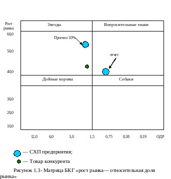 Полученное поле матрицы разделяется горизонтальной и вертикальной линиями на 4 квадрата, каждый из которых устанавливает определенные для находящихся в нем СХП. В зависимости от содержания этих характеристик все СХП делятся на 4 типа: «звезды», «вопросительные знаки», «дойные коровы», «собаки». Горизонтальная линия деления матрицы проходит на уровне значения, которое соответствует темпу роста отрасли. Вертикальная линия проходит через показатель ОДР=1,5, так как при этой величине ОДР начинают проявляться преимущества эффекта опытной кривой. Это означает, что предприятие, которое контролирует долю рынка большую, чем у ведущего конкурента в полтора и более раза, получает дополнительные конкурентные преимущества, связанные с экономией удельных издержек. Для каждого СХП делается оценка будущих темпов роста, рассчитывается относительная доля рынка, и полученные таким образом данные определяют его положение в матрице. Сравнительные данные по величине удельных издержек, которые взяты в процентах, показывают, что с ростом показателя ОДР предприятие достигает все более значительного сокращения удельных издержек по отношению к своему конкуренту. В этом случае у него появляются дополнительные возможности в снижении цен ил проведении более интенсивной стратегии продвижения.