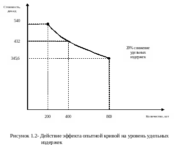 Практикой установлено, что диапазон этого снижения в зависимости от особенностей производства может колебаться от 10% до 30%. Чем более сложной и наукоемкой является продукция, тем выше эффект. На рисунке 1.2 рассмотрим действие эффекта опытной кривой на удельные издержки при показателе 20%. Предположим, что издержки на производство и сбыт составляют 540т. ден.ед. при общем объеме 200 единиц продукта. В этом случае удвоение объема производства и сбыта до 400 единиц приведут к снижению удельных издержек на 20% и составят 432т. ден.ед. Последующее удвоение до 800 единиц снова повлечет снижение уровня удельных издержек на 20%, и они составят уже 345,6т. ден.ед. и т.д. Таким образом, предприятие, достигающее удвоения объемов производства и сбыта своей продукции, получает дополнительные преимущества в конкуренции на основе относительной экономии издержек при том же качестве товаров.