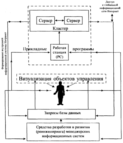 Современные перспективы использования компьютерных средств для информационного менеджмента связаны с визуальным отображением объектов управления с использованием геоинформационных систем, обеспечивающих привязку информации к объекту управления. Архитектуры компьютерных систем представляют собой сети компьютеров с мощной центральной машиной - сервером. Сервер поддерживает эффективный обмен с рабочими станциями, автоматизированными рабочими местами системных менеджеров, эффективный обмен, используя информационную технологию «клиент-сервер».