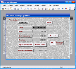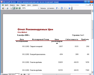 Далее возвращаемся в главное меню и открываем форму «Результаты», где уже сведены все данные о себестоимости товара, предлагаемой цене и прибыли от реализации товара по этой цене. В этом окне можно просмотреть и распечатать сводный отчет об уровне рекомендуемых цен.
