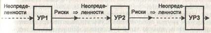 Неопределенности — основная причина появления рисков. Поэтому уменьшение объема неопределенностей, вызывающих риски потерь, составляет важную задачу руководителя. Если имеется несколько УР, следующих друг за другом, то риски предшествующих УР становятся неопределенностями для последующих (рис. 8.2).