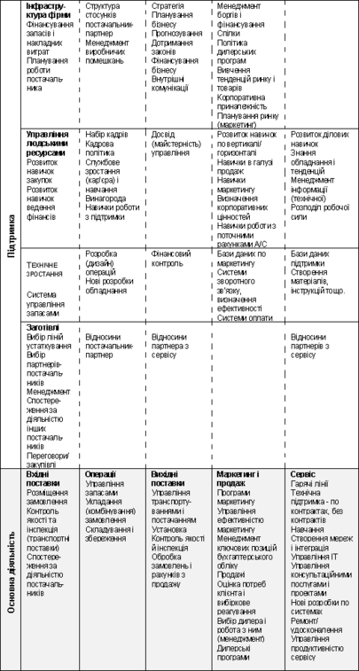Залежно від виду діяльності (виробництво, торгівля, фінансові послуги і т.д.) змінюється взаємозалежність і розташування ключових елементів конкурентних переваг компанії. Наприклад, для оптовика позиції "операції" і "постачання" є критично важливими. Для перепродавця важливішим моментом є сервіс. Проте для обох категорій критично важливим є контроль цін і витрат на всіх ділянках ланцюжка створення додаткової вартості споживачу.