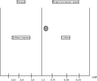 ОДР ниже единицы свидетельствуют о слабых конкурентных позициях на рынке. Чем больше ОДР повышает единицу, тем более высокой является конкурентоспособность данного предприятия или отдельного СХП. Полученное поле матрицы разделяется горизонтальной и вертикальной линиями на 4 квадрата, каждый из которых устанавливает определенные для находящихся в нем СХП характеристики. В зависимости от содержания этих характеристик все СХП делятся на 4 этапа: "звезды", "вопросительные знаки", "дойные коровы", "собаки". Горизонтальная линия деления матрицы проходит на уровне значения, которое соответствует темпу роста отрасли или рынка в целом. Вертикальная линия проходит через показатель ОДР=1,5, так как при этой величине ОДР начинают проявляться преимущества эффекта опытной кривой. Это означает, что предприятие, которое контролирует долю рынка больше, чем у ведущего конкурента в полтора и более раза, получает дополнительные конкурентные преимущества, связанные с экономией удельных издержек.