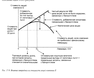 Однако за пределами Д2 издержки, связанные с банкротством, превышают выгоды от налоговых льгот, поэтому, начиная с этой точки, увеличение доли долга снижает стоимость акций. Следовательно, Д2 обозначает оптимальную структуру капитала.