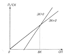 По вертикали отразим отношение прибыли (П) к собственному капиталу (СК); по горизонтали – величину операционной прибыли (до уплаты процентов и налогов) (ОП). Изобразим две прямые: первая означает, что заемный капитал (ЗК) равен нулю, а вторая – ЗК> 0.