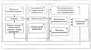 4. Удовлетворение (10) - результат внешних и внутренних вознаграждений с учетом их справедливости (9). Удовлетворение (10) является мерилом насколько ценно вознаграждение (1) на самом дело, эта оценка будет влиять па восприятие человеком будущих ситуаций.
