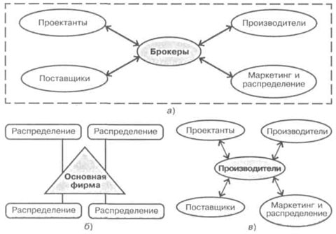 Рис.15. Сетевые организации: а - внутренняя; б - стабильная; в - динамичная.