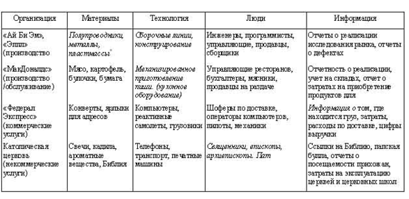 В общих чертах цели всякой организации включают преобразование ресурсов для достижения результатов. Основные ресурсы, используемые организацией, как уже говорилось выше, это люди (человеческие ресурсы), капитал, материалы, технология и информация. В таблице 1.1 приведена взаимосвязь между целями и ресурсами различных организаций0.