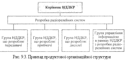 Структура, організована за продуктовою чи технологічною ознакою (тематичний тип структури) надійно орієнтує служби НДДКР на вимоги і проблеми виробництва, збуту і змушує працівників НДДКР орієнтуватися на кінцевий результат. Основні переваги такої структури в тому, що підвищується особиста відповідальність керівництва і творчих спеціалістів за своєчасне та якісне виконання роботи відповідно до теми; збільшується ймовірність появи принципово нових ідей, можливість сумісництва етапів розробки, організації їх виконання за паралельно-послідовною схемою, можливість уніфікації конструкторсько-технічних рішень у рамках виконання певної теми. Однак і тематичній структурі притаманні недоліки. Перш за все підвищена увага до даного напряму розробки породжує небезпеку недооцінки довгострокових і функціональних досліджень, а також труднощі в підвищенні кваліфікації персоналу; виникає нерівномірність завантаження лабораторного устаткування й експериментальної бази; відносно низька інтенсивність використання ресурсів у зв'язку з неможливістю повного завантаження спеціалістів вузького профілю та ін. Приклад оргструктури підрозділу НДДКР, побудованої за продуктовою ознакою, наводиться на рис. 9.3. Саме таку структуру мав підрозділ НДДКР фірми «Дженерал електрик», що розробляє радіорелейні системи.