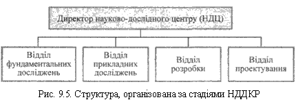 Фазна структура, або структура, що організована за стадіями НДДКР і передбачає таку форму розподілу праці, коли створюються підрозділи теоретичних і пошукових досліджень, інженерно-технологічних розробок, проектування, створення дослідних зразків і т. д. Тобто фазна структура дає змогу вченим вести наукову роботу, а інженерному складу— цілком присвятити себе роботі відповідно до своєї спеціалізації. Недоліком цієї структури є відсутність гнучкості, особливо в разі частої зміни продукції, що випускається. Ця структура виправдовує себе в галузях, де одна й та сама продукція випускається тривалий час. На рис. 9.5. показана організаційна структура за стадіями НДДКР.