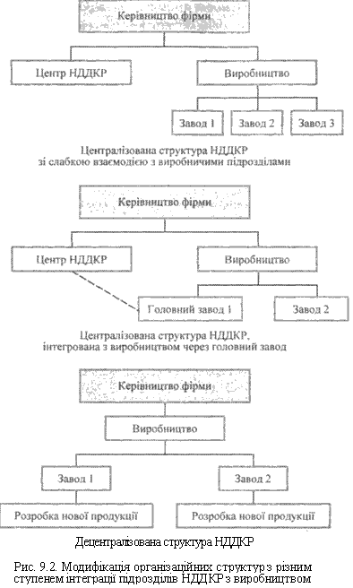 У наш час організаційні структури підрозділів (служб) НДДКР дуже різноманітні. Фірми використовують п'ять різновидів організації НДДКР, кожна з яких має свої переваги і недоліки. Проблема полягає у виборі та використанні критеріїв організаційної побудови служб НДДКР на промислових підприємствах. Ця проблема перебуває, в тісному зв'язку з вибором стратегії, яка потребує, як уже зазначалось, враховування конкретних умов конкуренції та накопичення капіталу. Американські фахівці вирізняють такі види організаційних структур за ознакою: • Структура, організована за галузями науки (сферами знань) і техніки — функціональна структура. • Структура, організована за продуктовою чи технологічною ознаками (тематичний тип структури). • Структура, організована за проектами (проектна). • Структура, організована за стадіями НДДКР (фазна). • Комбіновані структури (системно-компонентні). 1. При функціональній структурі підрозділи НДЦКР поділяються на сектори, відділи, які займаються певною (іноді дуже вузькою) галуззю науки. Найважливіша перевага цієї структури полягає в тому, що в одному підрозділі можуть бути створені злагоджені групи висококваліфікованих фахівців. Виникає творча атмосфера, усувається паралелізм і дублювання в роботі. Недолік полягає в тому, що функціональна форма організації управління спричиняє певну ізольованість окремих сфер НДЦКР. У рамках фірми виникає організаційний розрив між науково-дослідними відділеннями, лабораторіями, з одного боку, і виробництвом, службами збуту і вивчення ринку — з іншого. При організаційній автономії важко домагатися тісного співробітництва фахівців, ускладнюється планування, контроль і оперативне регулювання процесу виконання дослідних та проектних програм. Виникає потреба у великій кількості узгоджувальної роботи на горизонтальному рівні. Співробітники підрозділів, побудованих за функціональним принципом, стають вузькими спеціалістами і можуть бути неспроможними вирішити питання, які виходять за традиційні межі їх спеціалізації. На рис. 9.2. показана модифікація організаційних структур промислових організацій з різним ступенем інтеграції підрозділів НДЦКР з виробництвом.