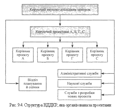 Проектна структура застосовується в тих випадках, коли основним завданням є одночасне виконання кількох проектів, що потребує залучення фахівців різних галузей науки. Така оргструктура має велику гнучкість, оскільки з початком нового проекту необхідно визначити кількість дослідників певних спеціальностей і об'єднати їх у групи. Ця оргструктура застосовується в організаціях, де переважають розроблювані на всіх стадіях створення нового продукту, особливо вона ефективна на останніх етапах розробки нового продукту. Проектна структура полегшує планування, контроль, оцінку проекту як за науковими, так і комерційними критеріями. Організація робіт за проектами характеризується високою оперативністю і швидкістю реалізації розробок, оскільки саме ці підрозділи відповідають і за їх упровадження у виробництво. Основним недоліком цієї організаційної структури, на думку американських експертів, є дефіцит часу у науковців для вивчення і вирішення перспективних завдань та проведення фундаментальних досліджень. На рис. 9.4. показана проектна оргструктура.