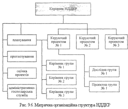 На практиці часто застосовуються комбіновані (системно-компонентні) організаційні структури. Вони створюють найкращі можливості для швидкого та якісного виконання всього комплексу робіт НДДКР. До таких комбінованих структур належить матрична структура, яка поєднує в собі ряд ознак як продуктового (тематичного), так і функціонального порядку. Головною перевагою матричної організаційної структури є її гнучкість, коли робітник може виконувати дві функції, наприклад, бути керівником проекту й одночасно виконувати в ньому значний обсяг робіт. Матричну організаційну структуру можна з успіхом використовувати на різних етапах циклу розробки нового проекту в міру просування від одного виду робіт до інших (фінансування ідеї, розробка зразка, експериментальні роботи і т. д.). На рис. 9.6. наведена схема матричної структури. Існують два види матричної структури: проектно-матрична і функціонально-матрична. В організації з проектно-матричною структурою співробітники функціональних підрозділів безпосередньо підпорядковуються керівникові проекту (теми) на весь час його виконання. Керівник розподіляє завдання всім виконавцям, координує і контролює їх діяльність, тобто єдиноначально здійснює загальне керівництво роботами за темою (проектом). Керівник функціонального підрозділу подає своїм працівникам необхідну методичну допомогу, розподіляє спеціалістів за напрямами роботи тощо.