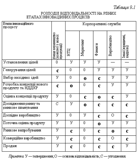 До складу комітету, як правило, входять усі члени правління, а також провідні спеціалісти технологічного відділу, відділу маркетингу. Рекомендується на засідання комітету запрошувати керівників виробничих підрозділів, на які буде покладатись основний обсяг роботи з розробки і реалізації інновацій. Запрошені наділяються тими ж правами при обговоренні рішень, що й постійні члени комітету. Комітет приймає рішення відносно того, чому віддати перевагу: зосередитись на продуктових чи процесних (технологічних) інноваціях. Далі вище керівництво (рада директорів) оцінює, буде це технологічне чи ринкове лідерство, чи «прямування за лідером», імітація, пошук «ніші» чи якась інша стратегія. У зв'язку з вибраною стратегією визначаються можливості фірми відносно масштабів інноваційної діяльності, оцінюється прийнятливий рівень технологічного, фінансового і маркетингового ризику. При цьому враховується можливість використання «запозичених» і власних технологічних рішень. Після цього розроблюються і затверджуються плани НДДКР, приймається рішення про початок виробництва нової продукції. Поточне керівництво покладається на віце-президента з НДДКР, який нерідко є і директором НТЦ. Координаційний комітет— консультативний орган, що виконує функцію узгодження інтересів. Він складається з представників керівництва НТЦ, виробничих відділень, служб постачання, фінансів, маркетингу, продажу. Кожна служба корпорації, кожен підрозділ несе відповідальність за певну її функціональну сферу діяльності (частина інноваційного процесу). Будь-яка ініціатива посилається на узгодження і затвердження лінійно знизу вверх. У цій традиційній формі переважає механістична система управління. Це означає проведення НДДКР, забезпечення їхнього зв'язку з виробництвом і маркетингом переважно силами самого НТЦ, тобто штатним персоналом на власній матеріально-технічній базі. У табл. 9.1 подана відповідальність різних служб НДДКР та їх координація. До основних функцій лабораторії належать: • розробка нових видів продукції, що можуть бути виготовлені на діючих виробничих лініях; • поліпшення існуючих видів продуктів і процесів для підвищення їхньої якості; • рішення виникаючих науково-технічних проблем на підприємствах (зокрема, у цехах), що входять у виробниче відділення; • надання технічних послуг і обслуговування замовників. Особливий підхід до інноваційної діяльності в сучасній великій корпорації полягає в централізації проведення фундаментальних досліджень і посиленні децентралізації розробок та поточного вдосконалювання продукції і процесів (рис. 9.2). На думку керівників фірм, що дотримуються принципу децентралізації управління, розукрупнення величезних науково-технічних комплексів прискорює процес вирішення організаційних питань, поліпшує якість контролю, підвищує ефективність НДР.