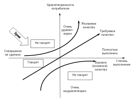 На рис. 1 представлена типичная зависимость степени удовлетворенности потребителя от степени реализации ожидаемых им параметров качества в предлагаемом ему продукте [5, с. 46].