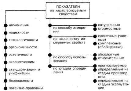 Показателями качества инновации могут быть любые параметры и свойства изделия. Для наиболее исчерпывающего представления о техническом уровне нововведения показатели подразделяются по свойствам, способу их измерения, стадиям производства и эксплуатации. Для полноты характеристики применяются как абсолютные показатели свойств в натуральном или стоимостном выражении, так и относительные. Причем относительные показатели - это обычно отношение абсолютных показателей старого к показателям нового или улучшенного образца, а также удельные или расходные показатели материалоемкости, трудоемкости, себестоимости на единицу измерения мощности, производительности и т.д. Эти параметры - основа оценки технического уровня и качества новшества. Их классификация схематично показана на рис.1.
