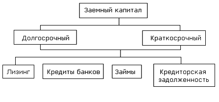 Заемный капитал (рис. 1) — это кредиты банков и финансовых компаний, займы, кредиторская задолженность, лизинг, коммерческие бумаги и др. Он подразделяется на долгосрочный, (более года) и краткосрочный (до года).