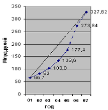Делая вывод, можно сказать, что позитивные тенденции развития торговой отрасли в 2005 году сохранены. В течение всего года отмечались устойчивое увеличение оборота розничной торговли и достаточная насыщенность торговой сети основными продовольственными и непродовольственными товарами, соответствующая платежеспособному спросу населения. По составленному прогнозу видно, что среднегодовой прирост оборота розничной торговли составляет 53,78 млрд.рублей, то есть в 2006 году оборот розничной торговли может составить 273,84 млрд.рублей, а в 2007 году – 327,62 млрд.рублей.